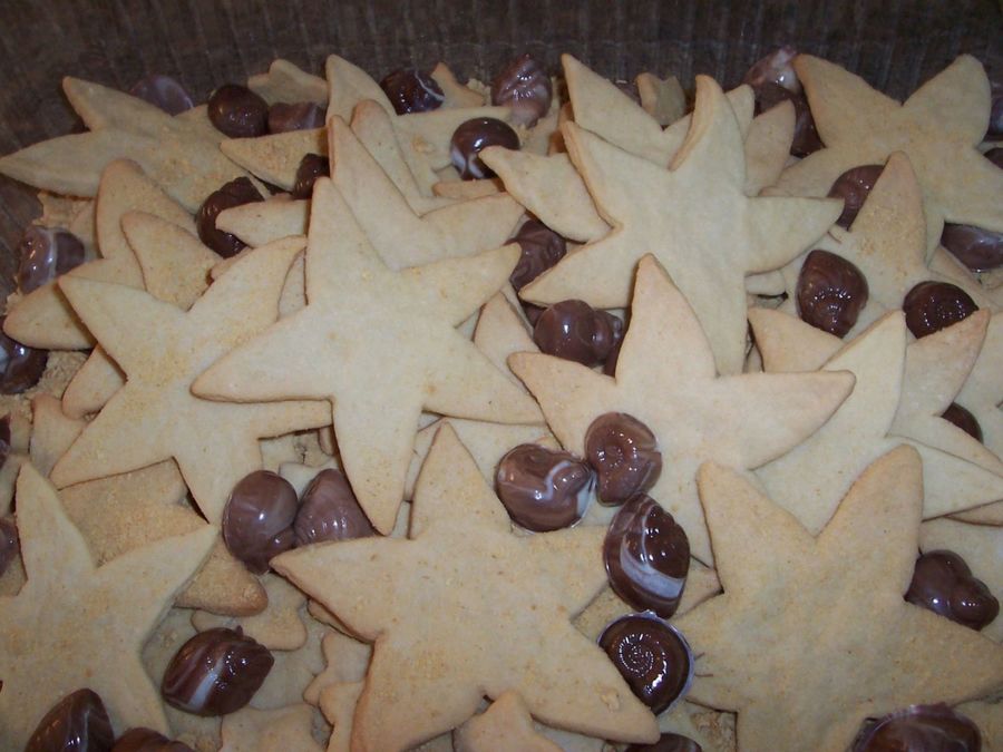 star sugar cookies, chocolate vanilla swirl seashells on graham cracker crumb sand