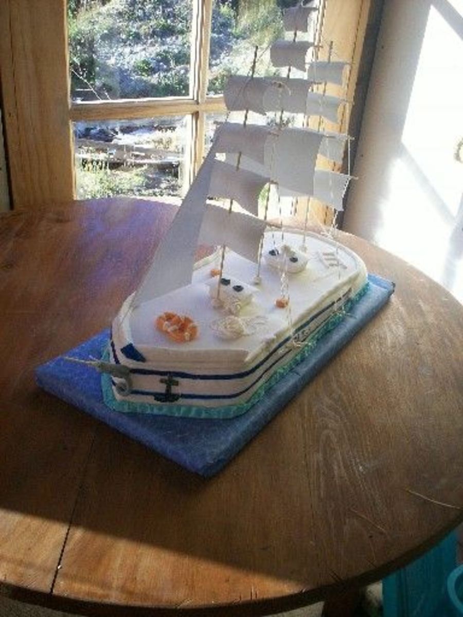 Cubierto en fondant, las velas del barcpo son hechas con brochetas, hilo de algodón y goma eva color blanco. Muy sencillo de hacer...