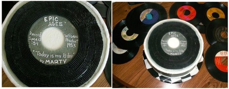 A record cake for a 50's theme party. All wording on the cake pertained to the "victim's" age. I used the basket tool for the lines on the record.