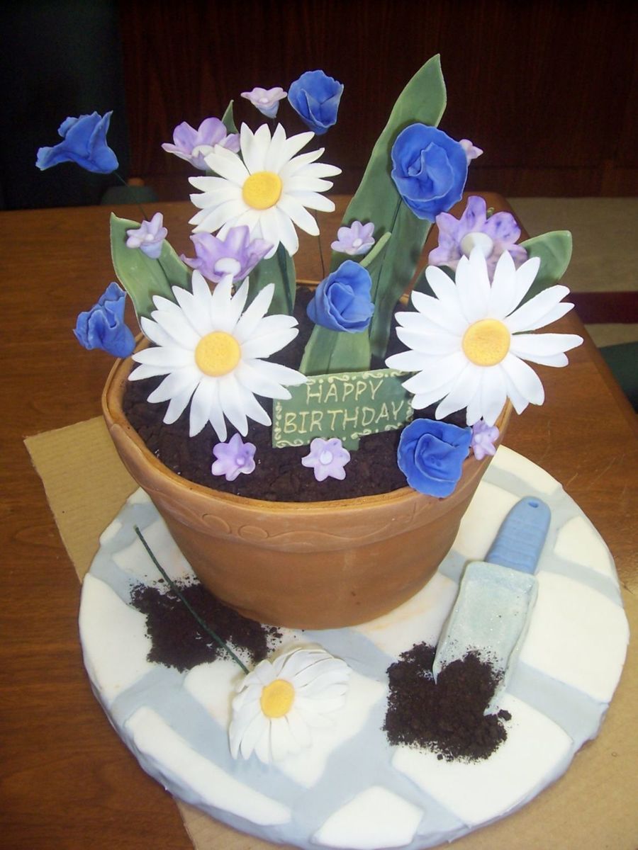 The flower pot is the cake (4 layers, stacked, carved and covered in fondant). The flowers, shovel, and base are made out of fondant. The dirt is crushed oreos.