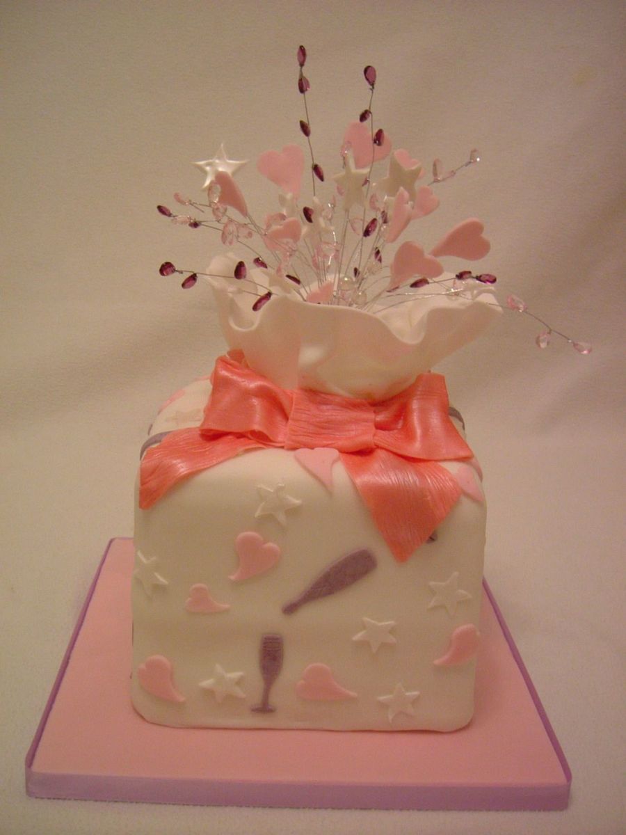 a stacked square cake with gems and hearts on wires..inspired by Lindy Smiths book