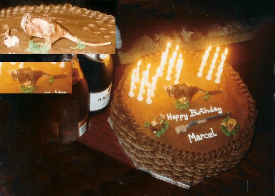 This is one of my first cakes, The kangaroo is made out of sugarpaste, I borrowed 16 books from the local libray with all different angled photographs of kangaroos. 3 days later, I managed to get a very detailed body with all muscles hair and face that looked just like the real thing! Unfortunately the Camera used does not show enough detail. I did find another angle on another photo wich I placed it on the top left corner but sadly by then it was already decapitated.