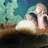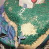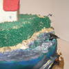 My most detailed (difficult) cake yet. 2 layer 12" round Hummingbird cake filled with white choc. cream ch. BC with airbrushed MMF. An 8" comma Snickerdoodle cake is above that. The lighthouse is mostly RKT, covered in MMF. The cage's vertical bars are gp (as are the other red pieces of that section) and the horiz. bars are RI. An edible clear gem was used for the lens of the light and around that is gelatine sheets held by gp and RI. The shells are candy melts, the anemones & fish fondant, the whale's