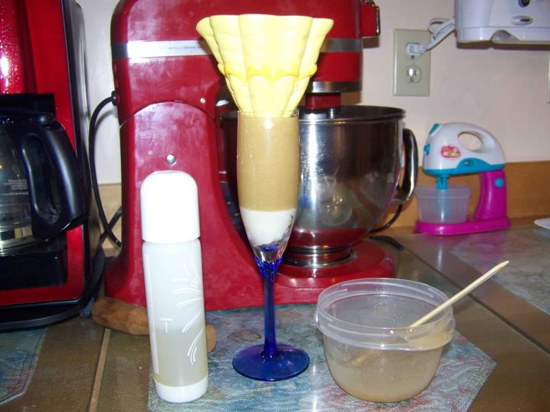 You can move the head around while still soft, for desired effect, one is looking up, the other down. We also have 2 different skirt top shapes. And 1 is holding a scarf effect, the other is not! Both from the same mold, play with it! Now you can have a totally edible Princess, or Barbie, cake. Just put one of these on top, instead of a real doll, and it looks just as good! (Assuming you can paint! lol)) Push a few strands of nice thick spaghetti part way up from the bottom, and stick the rest into the cake, before adding the icing skirt. For a first attempt, I was quite pleased with them. Clarifying the mix before pouring will probably come in handy here, for an even smoother finish.