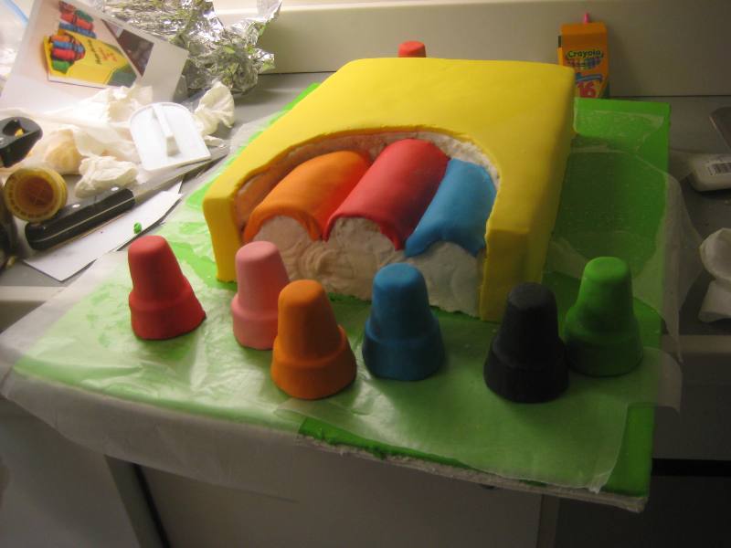 On one end, carve out a semicircle shape with three arches for the crayons. Again, be careful not to carve away too much of the cake because you'll need enough height to comfortably stack two rows of ice cream cones.