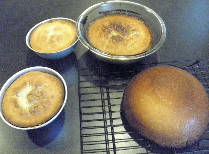Before Filling the cakes, take one of the big half round cake (the one you baked in the Pyrex bowl) and slice the bottom part of the cake, about 2" thick (do not discard), this way more cake surface is actually touching the cake board. If you don't slice the cake button before filling, this half round might break in pieces due to weight of cake itself. This actually happened to me (remember this is the first time I make this cake so it was a matter of trial and error). You can always use a regular round shape pan, but if you hate carving, then using this bowls cakes are great way to avoid so much mess. Most of the time, these Pyrex bowls are flat on the bottom. Now take the part you sliced before and place it on the very top of the other half round.