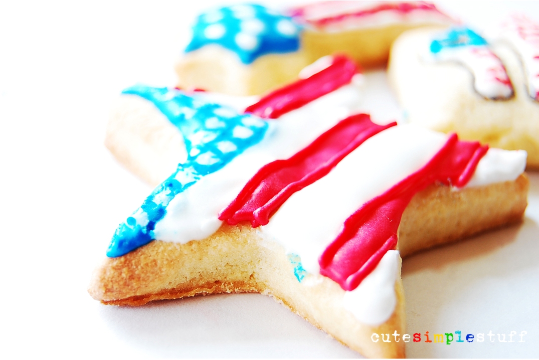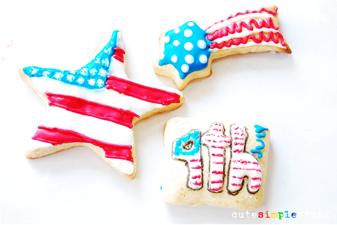 4th of July Cookies By CuteSimpleStuff tutorial Happy 4th of July!This is a really fast, easy and last minute really sweet idea to celebrate this day! I thought I´d share anyways since the week is not over yet. Here are the 3 ideas I could think of: Materials I used: Red, white and blue icing. In a 15 second consistency. I use a Royal Mix for this small proyects. Big star cookie cutter. Black food marker. Small star with tale cookie cutter. And a rectangular cookie cutter, of just do what I did, cut it using a knife. Cookie dough. Here is the one I always use, only 4 ingredients. Steps: Make your cookie dough, cut the shapes and bake according to instructions. Let cool. While that´s happening, prepare your royal icing, and gather all food colors and piping bags together. (I use Ziploc bags). Watch this: http://www.youtube.com/watch?feature=player_embedded&v=2sk41UrE2Lc And you are done! As mentioned in the video this are just ideas I wanted to share. Give them a try, and if you do, don´t forget to send me images @cutesimplestuff! Happy 4th of July, Renee