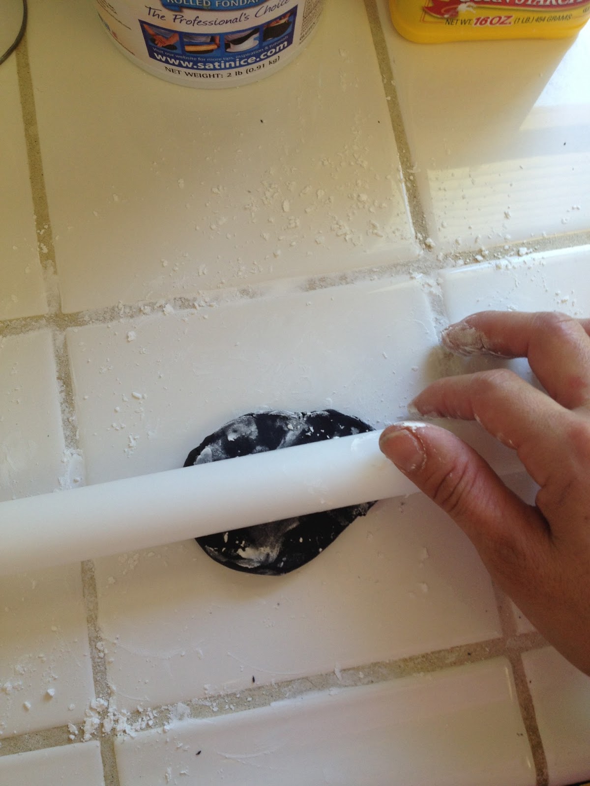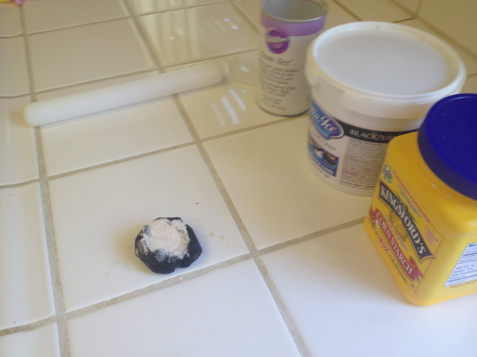 I like to use ready made black fondant. Sometimes the marshmallow fondant is a lot more trouble when it comes to making black! Put a good amount of Gum-Tex on the fondant and knead in fully. I like to use this combination instead instead of gumpaste. Fondant keeps it's color nicely and dry with a 'softer' look. Knead gumtex in fully.