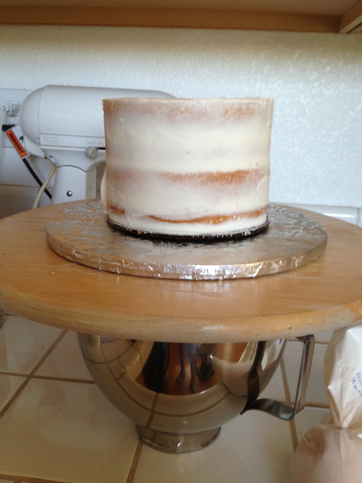 1. Crumb coat your cake with the same color you will be using to make the rosettes. Let the crumb coat firm up for at least an hour (I like to let it firm up for at least a few hours - I have found the longer you let your material get firm, the cleaner the end result looks)