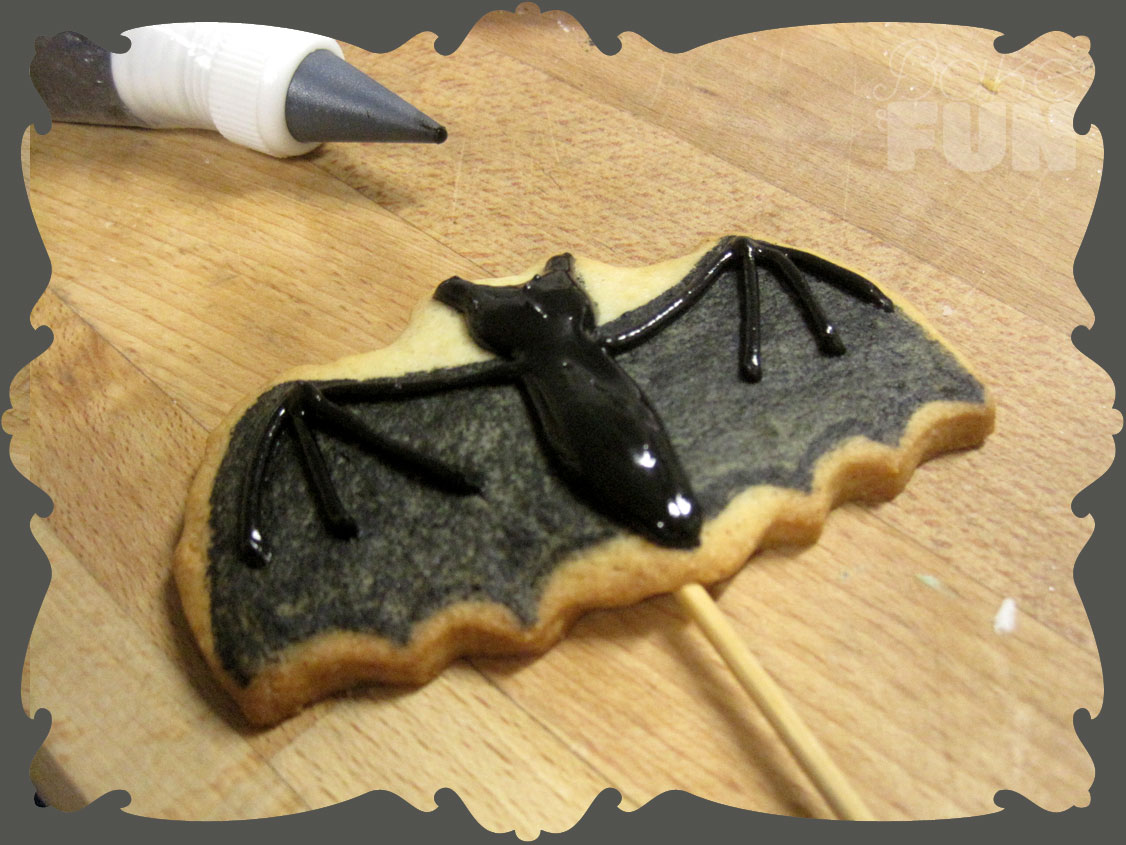 Step 5: Pipe the body and outline the wings using your black (normal) royal icing and inmediatly sprinkle some sugar over the cookie and let it dry completely.