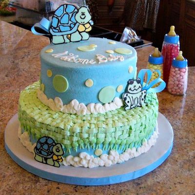 This was inspired by several similiar cakes in the gallery. It's two layers, bottom is chocolate with cookies and cream filling and top is butter pecan with maple cream cheese icing, covered with fondant. I used Michelle Foster's recipe listed here on CC. It works great. Although I did a terrible fondant job on the top layer (the bottom I did fine). That's why there are more mountains on layer two, to hide it, LOL. The cars are toys we bought. The writing is on rice paper with computer.