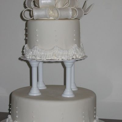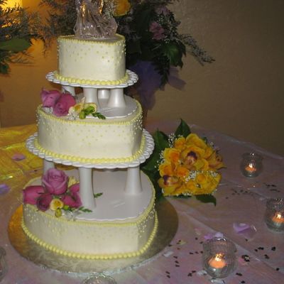 This cake was for a friends daughter turning 8. She wanted a princess cake and with many thanks to Karateka for her help with the tiara - she was the happiest little girl in the world. I wasn't pleased with the look after I put the pearls on the cake - I pressed them too hard. I put heart shaped cut outs around the base of the cake too. The cake is vanilla with rainbow sprinkles mixed into the batter for a colorful surprise inside. Icing is BC with a gumpaste tiara and bow - ribbon & pearls are fondant