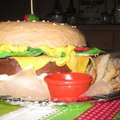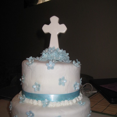 this cake was done by my nephew. I helped it was his first cake. he mix the batter. i just put the cake in the oven and took it out. covered in fondant. he really like to make cakes. he had some problems rolling the fondant there is some tears mostly in the back. his dad love it