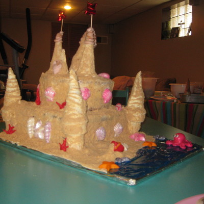 sugar cone and cones for the pillars, covered in buttercream, the sand is cookies. the seashell.