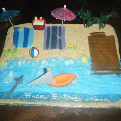 Pina Colada cake with filling. Buttercream frosting with gramcraker sand. Fondant accents except for the palm trees, beach umbrellas and dolphin.