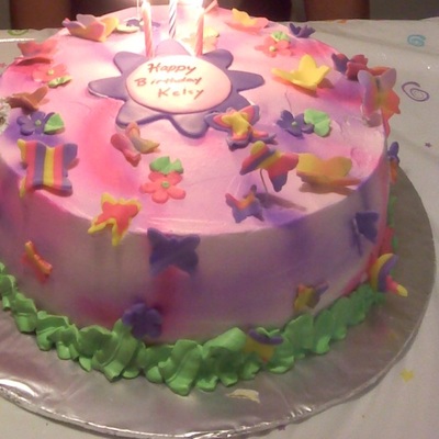 Tree milks cake filled with strawberries and cream. Covered in pastry pride with fondant butterflies.