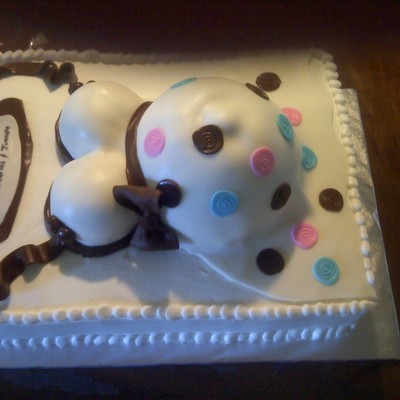 Here's another belly cake. Thanks to cakeinthebox4U for the inspiration. White cake with strawberries and kiwi filling. Covered in bc. fondant dress with dots.