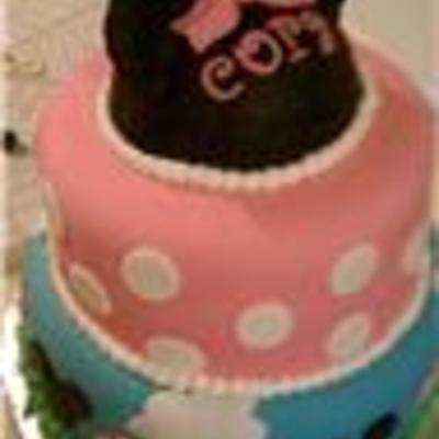 wasc cake and chocolate cake. all bc and covered and decorated w/ mmf. made the little hat out of rice krispies treats and covered w/ mmf. ... turned out a little lumpy but still kind of cute