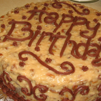 birthday cake for a friend. german chocolate cake with choc. scrolls