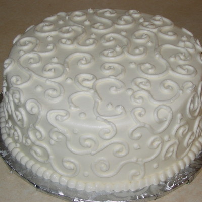 White chocolate cake w/ raspberry filling and bc frosting, covered in mmf.
