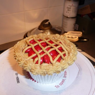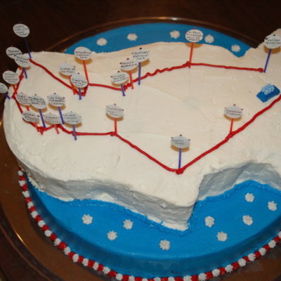 My first fondant cake. What a mess! Used both red Satin Ice and my own MFF colored black and green. They were both super sticky, and I ended up with cornstarch and crisco everywhere. It dried and cracked. Ugh. Sent it to work with hubby for a going away party for a co-worker returning to Palestine and no one cared about the fondant mess.