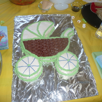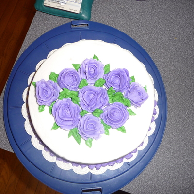 I forgot to take a picture of the final product once it was filled with fruit. This was for a breakfast gathering, so I used a blueberry oat coffee cake recipe with WW flour and low sugar (rather healthy, actually) and torted with stabilized whipped cream. Hollowed out the middle and used stabilized whipping cream tinted with cocoa powder to do basketweave and rope border. Filled with berries before the party.