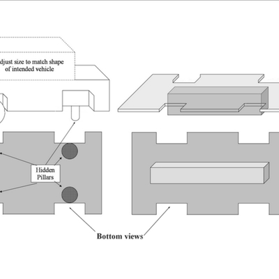 use masonite or similar board under cake. || dowels - screw to masonite just behind where wheels will go (left side of image) || solid support - use any material (foam, brick, piece of 2x4 or other wood) that can be glued or screwed to the masonite cake board.